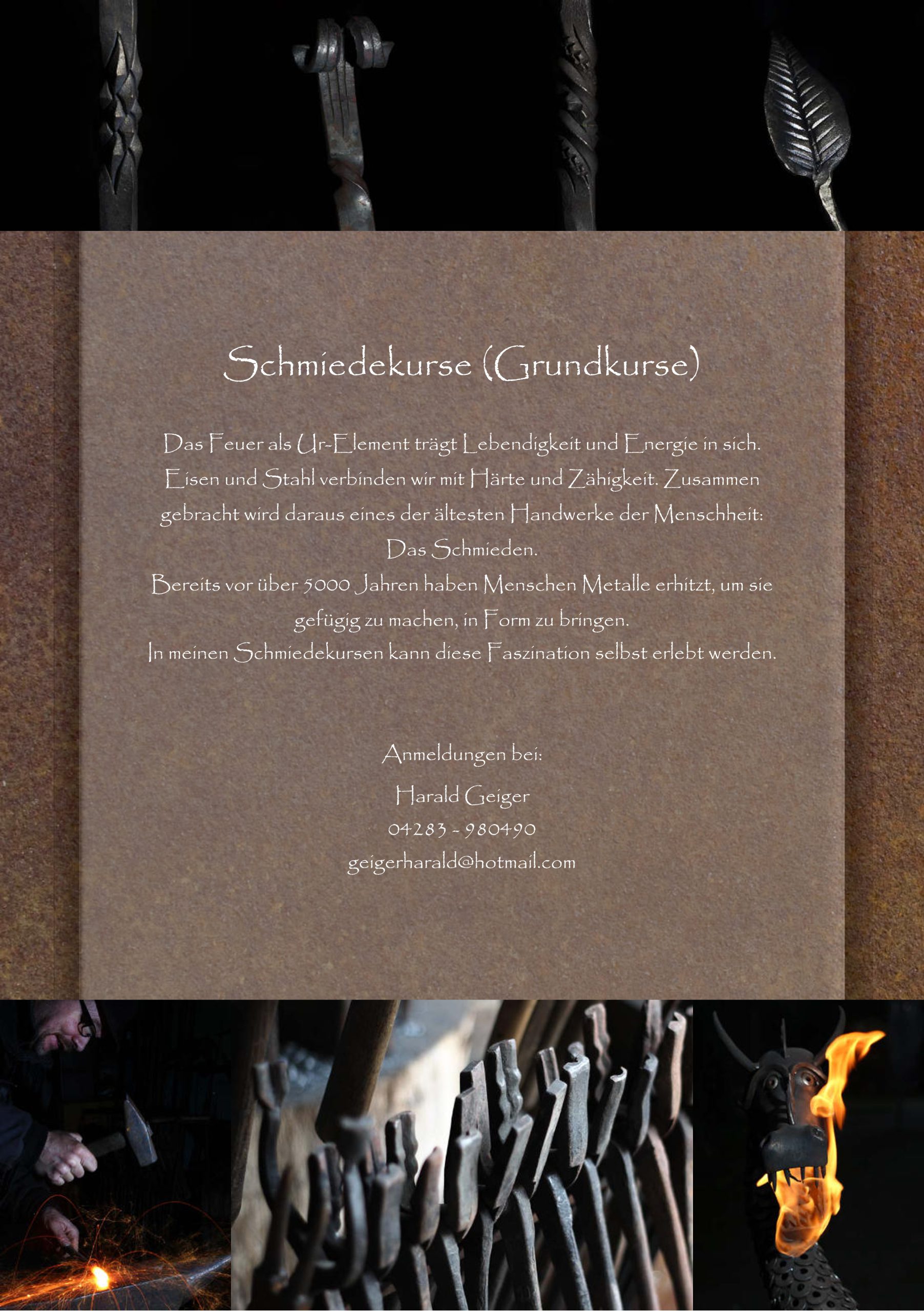 Die TeilnehmerInnen lernen in kurzer Zeit grundlegende Schmiedetechniken, die sie in die Lage versetzen, ihre eigenen Ideen in Werke und ihre Phantasien in Formen umzusetzen. Nach einigen Übungsstücken, durch die ein Gefühl für Werkzeug und Material angeeignet wird, besteht die Möglichkeit, mit eigenen Ideen kreativ zu werden.